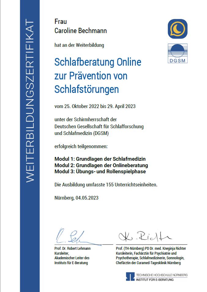 Um Familien ganzheitlich begleiten zu können, habe ich mich 2023 auch zur zertifizierten (Online-) Schlafberaterin für Erwachsene weitergebildet. Die Fortbildung erfolgte an der TH Nürnberg in Kooperation mit der Schlafambulanz des Klinikums Nürnberg und der PMU Salzburg, unter der Schirmherrschaft der DGSM. Der Fokus lag auf der Begleitung von Menschen mit Schlafproblemen auf Basis der Kognitiven Verhaltenstherapie für Insomnie